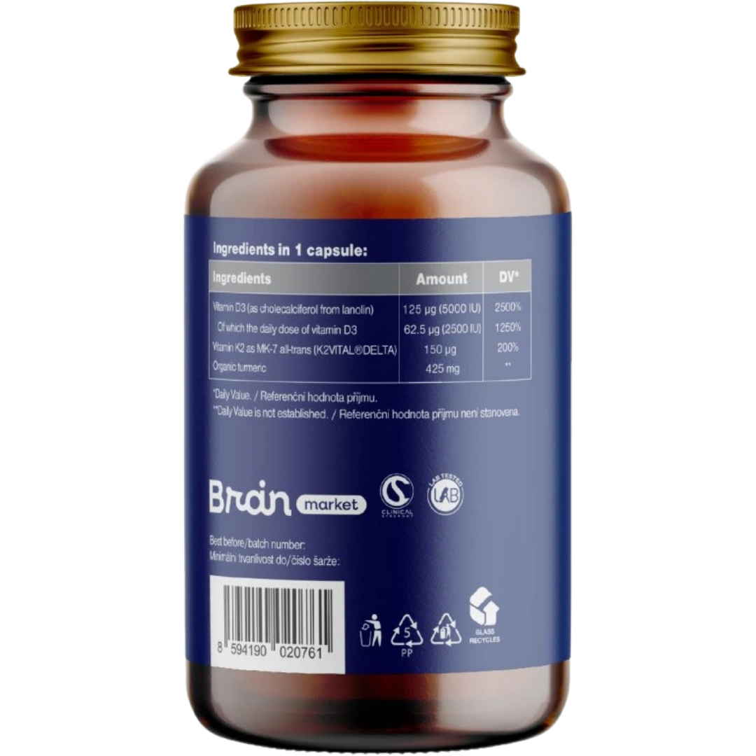 BrainMax Vitamin D3 + K2: Zásadní pro kostní strukturu. Směruje vápník do kostí, což je nezbytná prevence zhoršování kostních deformit u halluxů.
